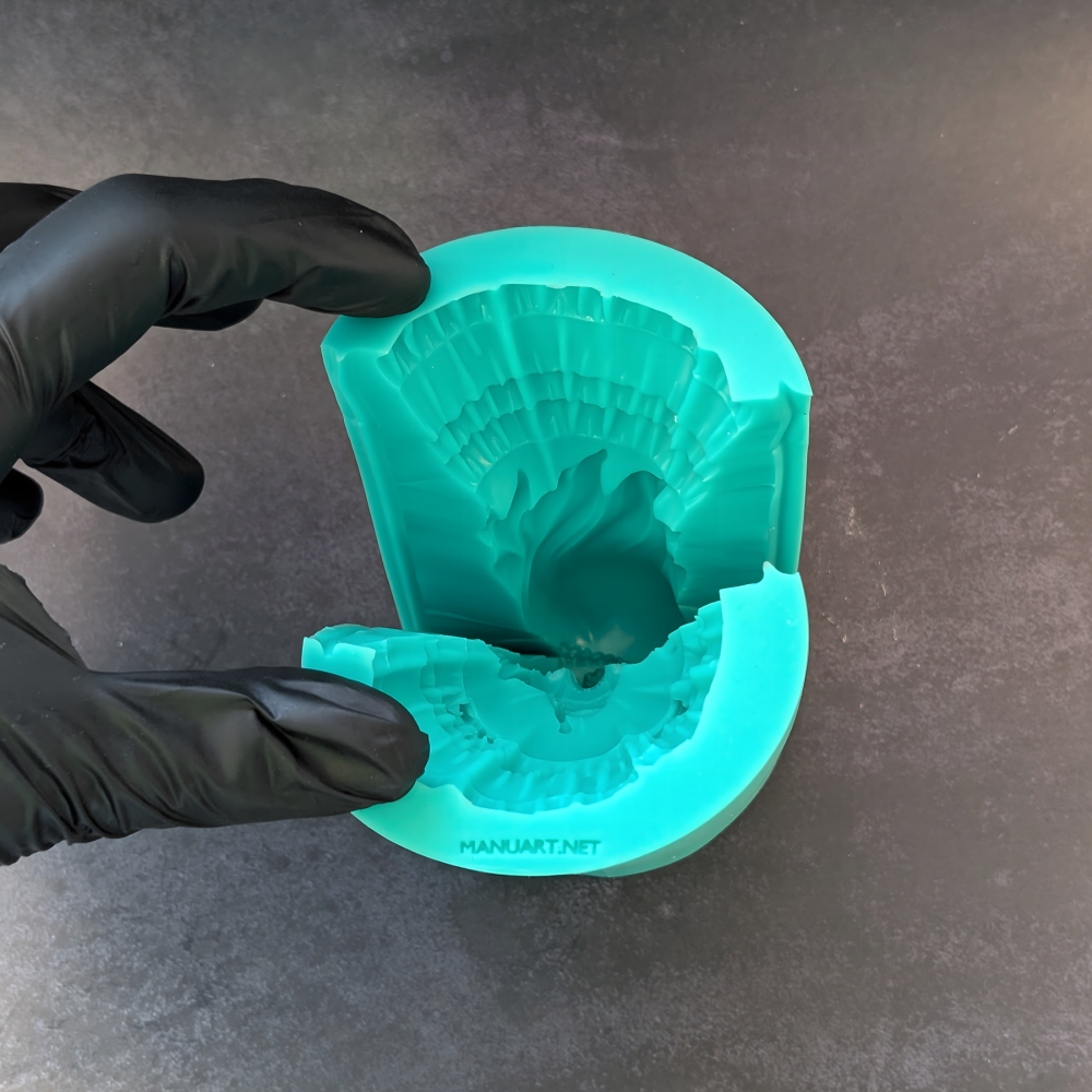 • Forma ma 2 nacięcia z rowkami ułatwiającymi wyjmowanie odlewu; do każdej formy dołączamy gumki do stabilnego zamknięcia podczas zalewania